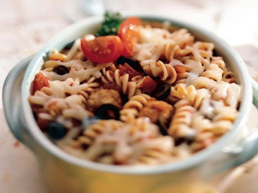Cut each meatball in half. In greased casserole, combine meatball halves, pizza sauce, olives and cooked rotini; mix well. Cover.