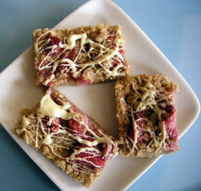 7. Melt the white chocolate in microwave, following directions on package. Drizzle melted chocolate in thin lines over the streusel top. Cut into bars.