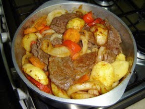 - En una cacerola caliente con aceite cocine los bifes intercalándolos con las rodajas de tomate, condimente con sal y pimineta y agregue el morrón junto con la cebolla, cocine unos minutos y añada las papas, corrija nuevamente con sal y pimineta y agregue el pimentón, ajo picado, nuevamente bifes, rodajas de tomate, morrón, papas, cebolla, sal, pimineta , pimentón, proceda del mismo modo hasta terminar de colocar todos los ingredientes, luego tape la olla con un papillote y cocine a fuego suave sin revolver durante 30 minutos. A mitad de cocción agregue los huevos crudos, condimente con sal y pimineta y espolvoree con perejil picado.