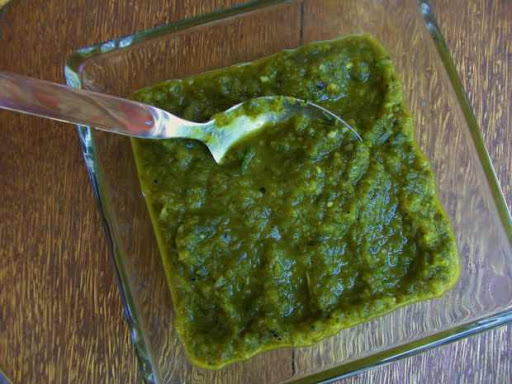 Heat oil in skillet. When hot, add contents of blender and cook for 5 minutes over medium heat, stirring occasionally. The salsa will thicken as it cooks, and may need more water added for a thin sauce consistency. Adjust salt. This makes a very fresh tasting, very green salsa.
