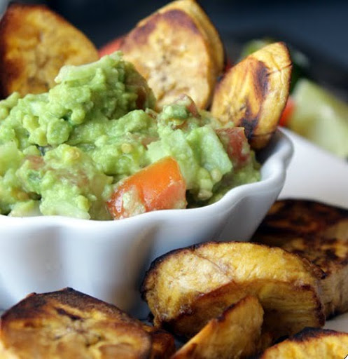While plantain is cooking, chop onion tomato. Mash up an avocado in bowl. Stir with a bit of lime juice. Mix in chopped veggies and a sprinkling of salt, pepper, and cumin. Serve at once.