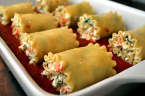 Butter a 9 inch square baking pan. On each length of lasagna noodle, spread 1/2 cup vegetable-cheese mixture. Roll up. Lay seam-side down in pan. Cover. Bake at 350° F for 20 minutes.