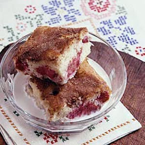 In a bowl, cream butter and 1 cup sugar. Add egg; beat well. Combine buttermilk and vanilla; set aside. Combine flour, baking soda and salt; add alternately with buttermilk/vanilla to the creamed mixture. Stir in rhubarb. Spread in a greased 13-in. x 9-in. baking pan. Combine the remaining sugar with cinnamon; sprinkle over batter. Bake at 350° for 35 minutes or until cake tests done. For topping, combine all ingredients; pour over individual squares. Yield: 12 servings.