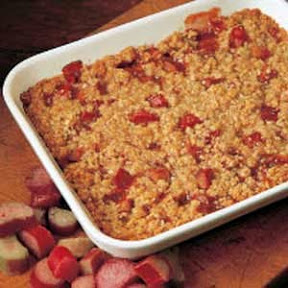 In a bowl, combine the flour, brown sugar and oats. Cut in butter until crumbly; sprinkle over rhubarb mixture. Bake at 350° for 40 minutes or until lightly browned and bubbly. Yield: 6-8 servings.
