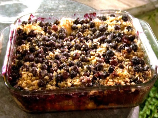 Combine blueberries and sugar in a bowl and toss to coat. Spoon over oats and biscuits and sprinkle with remaining 1/2 cup oats. Drizzle remaining melted butter on top. Bake for 20 minutes or until cake is golden brown and center is done. Cool for 20 minutes. Serve warm.