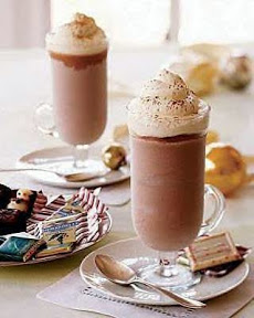 Combine the chocolate base mixture, the remaining evaporated milk and ice in a blender (you can do this in batches) and cover. Blend until smooth. Pour into frosty glasses. Top each with whipped cream. Sprinkle with additional chopped chocolate chips & mini marshmallows, if desired.