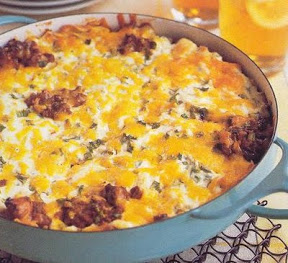 Cook the egg noodles according to package directions. Place the cooked noodles in the bottom of a large baking dish. Beat the cream cheese and sour cream together and spread over the noodles. Brown meat, drain and add to the spaghetti sauce. Pour the meat over the cheese mixture. Sprinkle with the cheddar cheese. Bake at 350 degrees for 20 minutes.