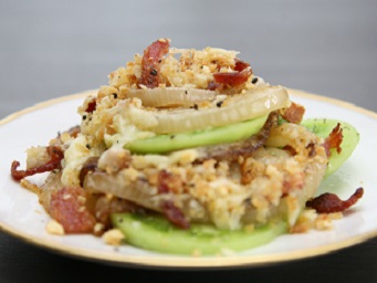 To assemble the gratin, overlap the green tomato slices in 1 row in a large baking dish, about 9 by 11 inches. Next, make a row slightly overlapping of the partially cooked onion rounds, being careful to keep the slices intact. Repeat steps until all tomatoes and onions are used. Season tomatoes and onions lightly with salt and heavily with pepper. Crumble the bacon over the vegetables; sprinkle the grated Cheddar over the top followed by the bread crumbs. Bake until the cheese is bubbly, about 30 to 45 minutes. If the top is getting too brown, loosely cover with foil.