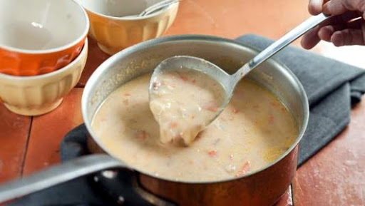 Ham, cheese, potato—like a loaded baked potato in a soup bowl.