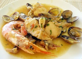 Cuando la cebolla este sofrita le añadimos un poco de harina, laurel, perejil , vino blanco , el caldo de pescado, un poco de tomate frito y azafrán. Le damos unas vueltas y añadimos el pescado, el marisco, los pulpos, los mejillones cocidos , unos piñones. Precalentamos el horno a 180º y metemos durante 5 minutos