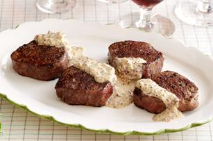 SEASON steaks with pepper. Heat oil in large skillet on high heat. Add steaks; cook 2 to 3 min. on each side or until browned on both sides. Cook 3 to 4 min. on medium heat or until steaks are medium doneness (160°F), turning occasionally. Remove steaks from skillet; cover to keep warm. Discard drippings from skillet.