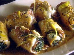 Arrange an even, thin layer of spinach atop the prosciutto slices. Sprinkle the Parmesan evenly over each. Beginning at the short tapered end, roll up each chicken cutlet as for a jellyroll. Secure with a toothpick.
