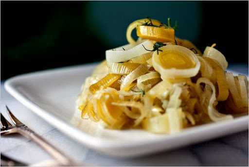 3. Spoon the olive oil into a wide, lidded skillet, and place the leeks in the skillet in an even layer. Pour in the wine, and add salt and freshly ground pepper to taste, and the garlic. Bring to a boil, cover and reduce the heat to low. Simmer for 30 to 45 minutes, until the leeks are very tender but still intact and most of the liquid has evaporated.