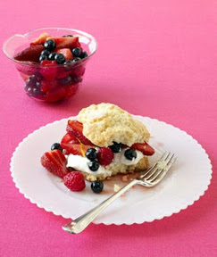 4. Meanwhile, with an electric mixer, beat the remaining cup of cream and remaining sugar in a medium bowl until soft peaks form. Split the biscuits in half. Place the bottoms on plates or on a platter. Top with the whipped cream, berries, and the tops of the biscuits. Serve immediately.