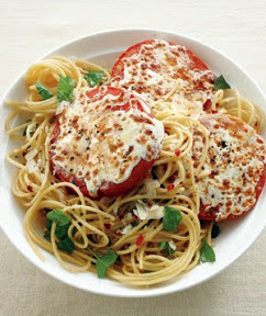Basil Spaghetti with Cheesy Broiled Tomatoes