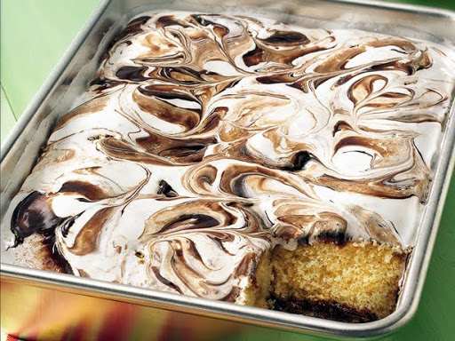 Spoon teaspoonfuls of marshmallow creme onto warm cake; carefully spread with knife dipped in hot water. Drop small dollops of reserved hot fudge topping randomly over marshmallow creme. Swirl topping through marshmallow creme with knife for marbled design. Cool 2 hours. Store uncovered at room temperature. (Once cut, store cake in the pan, uncovered, with plastic wrap pressed against cut sides.)