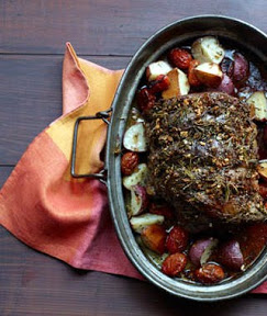 3. In a small bowl, combine the garlic, rosemary and remaining Tbsp oil, and rub it evenly over the meat. Roast the meat to the desired doneness, stirring the vegetables once, about 1 hour 15 minutes for medium-rare (when a meat thermometer registers 130ºF). Let rest for 10 minutes before slicing.