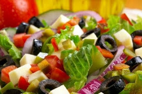My mother's idea of a perfect salad is a wedge of iceburg lettuce with lots of Russian dressing, but Dad always preferred romaine, so romaine was the primary salad in our family. Dad's the dressing maker; his formula is once around the bowl with oil and twice with vinegar. So here's our salad: you can add as many additional ingredients as you like but if you add a lot you may want to increase the dressing. I sometimes add a touch of garlic powder to the dressing.