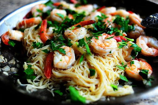 Throw angel hair pasta into the boiling water. Cook until just done/al dente. Drain, reserving a cup or two of the pasta water.