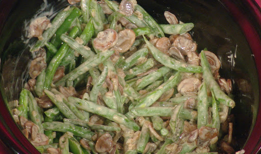 Put the trimmed and rinsed green beans into an empty 6-quart slow cooker insert, and pour the mushroom mixture evenly over the top. Stir to disperse ingredients. Cover, cook on low 5 hours, or on high about 2 hours. Stir again, and serve as-is, or top with a cup of French Fried onions.