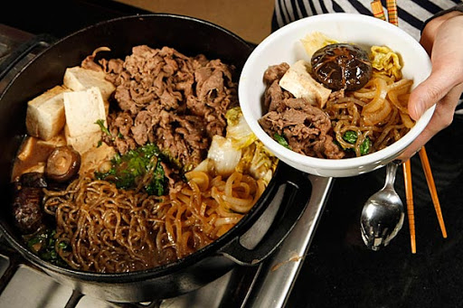 From LA Times. Note: Broiled tofu and itokonnyaku noodles are available at Japanese markets. Sliced rib-eye is generally available at Japanese and Korean markets; you could also ask your butcher to slice it. To slice the meat yourself, freeze it until it is partially hardened (2 to 3 hours), then slice very thinly against the grain with a very sharp knife.