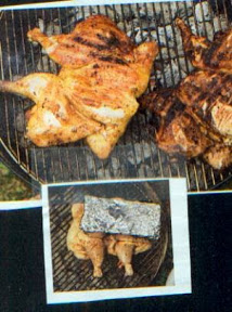 Place chicken on grill rack breast side up. Place brick on top. Cook 10 min or until browned. Remove brick, flip chicken over and grill over low heat until juices run clear when thigh is pierced, about 25 min. Transfer to cutting board and let stand 10 min before serving.