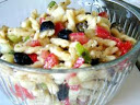 Drain and chill pasta. Add tomatoes, cucumbers and olives. Stir.