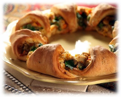 Place on a sprayed 12-inch pizza pan, forming a ring with pointed ends facing outer edge of pan and wide ends overlapping slightly.