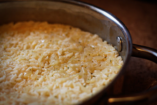 When the onions are translucent, add the rice. Saute until the rice gets light golden brown and takes on a slightly nutty aroma