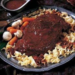 •In a Dutch oven, brown roast in hot oil. Combine water, beer or