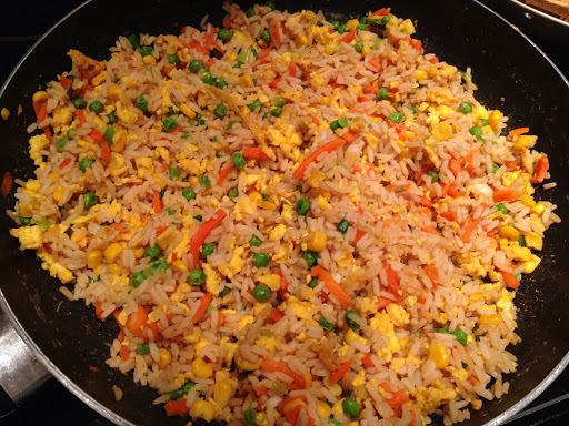 Make both bags of steamed rice. In pan put sesame oil and scramble eggs. Add chopped dinner onions. Then add rice bags. Add soy sauce and stir together.