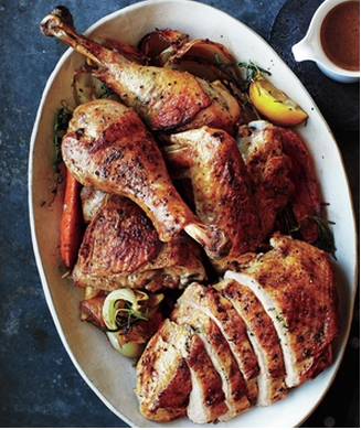 Transfer the thighs, drumsticks, and wings to a serving platter. Transfer the breasts to a cutting board and let rest for 15 minutes before slicing. Serve warm. Reserve the vegetables and any pan juices for the gravy.