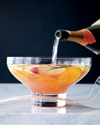 In a large punch bowl, combine the fruit, gin, lemon juice, simple syrup, orgeat syrup and framboise liqueur. Refrigerate for 4 to 5 hours. Just before serving, stir in the chilled Prosecco and add a supersize ice block.