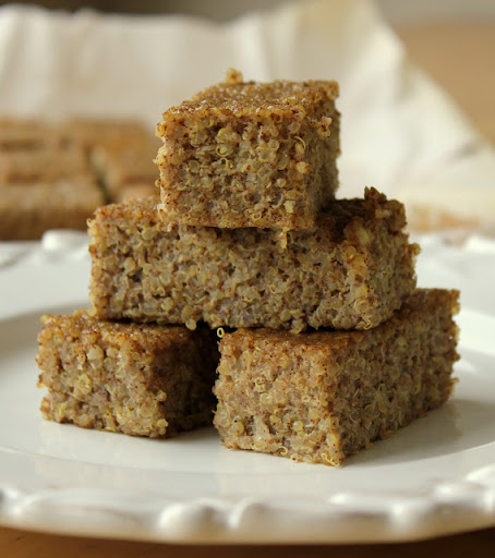 Preheat the oven to 375ºF and place the quinoa in a large mixing bowl. Line an 8-by-8-inch baking pan with lightly greased parchment.