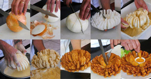 7. Remove about 1 inch of petals from center of onion (You can place the cut onions in cold water for a few hours to help "open" them up -- just make sure that you drain them well).