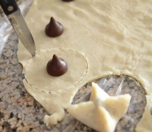 Roll out pie dough onto a lightly floured counter top. Place 10 kisses around the edges of pie dough, about 2 1/2 inches apart. Take a knife and cut a 2 1/2 to 3-inch circle around kiss. Fold half of pie dough around top of dough and pinch edge around top of kiss. Now, fold up both sides of remaining dough up to the tip of the kiss pinching edge. Now press together edges and form criss cross.