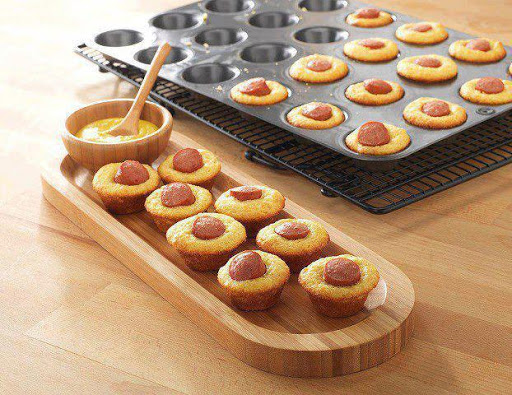 Mix up an 8.5oz box of corn muffin mix, divide batter into the Mini-Muffin Pan, and add hot dog slices. Bake for 10-12 minutes at 375°. Enjoy this fun way to serve corn dogs with "flair!