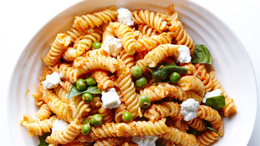 How do you get everyone to say 'Mamma Mia' with each bite? Simply whip up this quick and easy Roasted Red Pepper Pasta, fusilli coated in a creamy (yet cream-free) pesto-like sauce of roasted red pepper, sun-dried tomatoes, Parmesan, almonds and olive oil. Mixed with fresh green peas and topped with ricotta and basil, who could resist?Cover and let stand until ready to dress pasta.