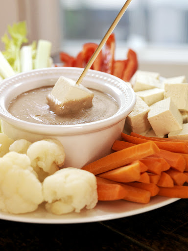 Peanut fondue is a perfect cocktail party dish. Serve with crispy pan-fried tempeh strips, firm tofu cubes, tiny boiled potatoes, and lightly steamed veggies. You can leave it in the slow cooker, and it will stay warm during your party.