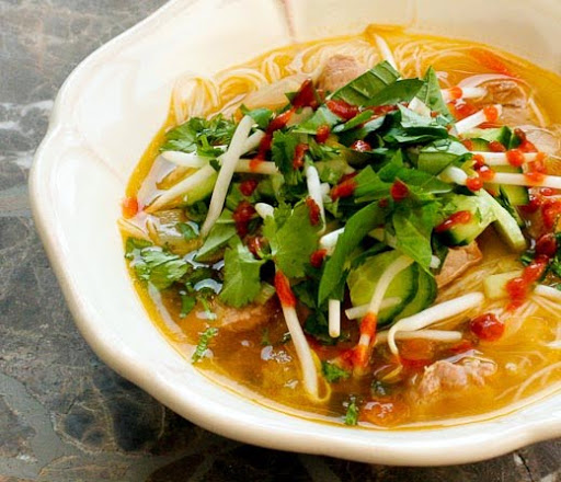 When the soup is done simmering, remove the cinnamon stick and star anise and stir in the juice of 1 lime. To serve, add rice noodles to your bowl, then spoon some soup over the noodles. Top with bean sprouts, fresh herbs, cucumber, fresh lime juice, and a drizzle of siracha. Serve immediately.