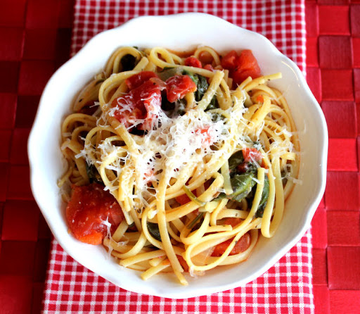 4. Once your broth has boiled add an 8 ounce package of fresh spinach, you could add more if you choose. (I hear spinach is good for you and can change your life for the better). Add the cans of tomatoes, along with the wonderful juice in the can. Toss in the onion, garlic and pasta as well.