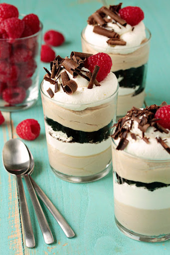 Create the Tiramisu base according to recipe directions. Layer it with freshly whipped cream and chocolate cookie crumbs. Finish them off with a sprinkling of chocolate shavings and fresh berries.