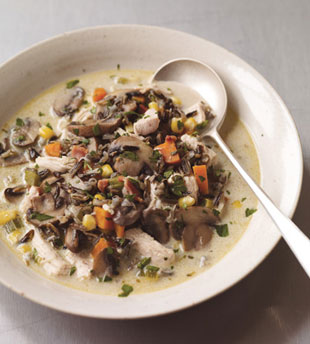 Add rice, pancetta, turkey meat, and corn to soup. Simmer to blend flavors, about 10 minutes. Stir in cream. Season to taste with salt and pepper. DO AHEAD Can be made 3 days ahead. Cool slightly. Chill uncovered until cool. Cover and keep chilled. Rewarm over medium heat before serving.