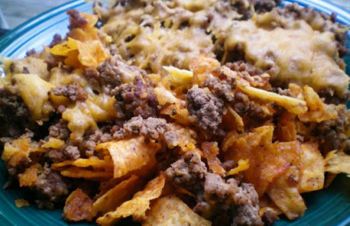 Layer ingredients in 9 x 13 pan as listed - crushed chips, meat and seasonings, 2/3 of cheese, lettuce, tomato, and remaining cheese. Bake at 350 degrees for 15 minutes.