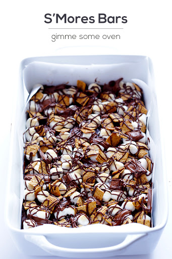 **To make the melted chocolate, add a crumbled Hershey's bar or some chocolate chips to a microwave-proof bowl. Heat in 30-second intervals, stirring between each interval, until melted. If the chocolate is too thick, add in a few teaspoons of shortening to thin it out. Drizzle with a fork over the s'mores bars.