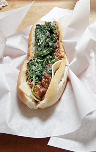 4. Place 4 slices provolone on bottom half of each roll, and top with pork. Add broccoli rabe and peppers.