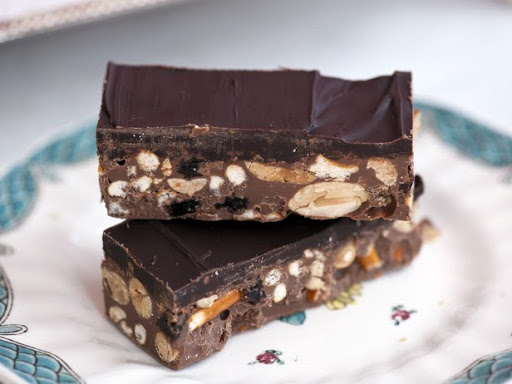 Melt your milk chocolate on low heat, stirring until completely smooth. Stir in the peanuts, pretzels and raisins.