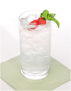 Carefully fold mint leaf in half lengthwise and place the stem end into the opening of the raspberry. Float on top of cocktail and serve immediately.