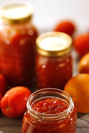 5. Seed and roughly chop the tomatoes and place them in a large pot. Stir in the remaining 5 cups sugar.