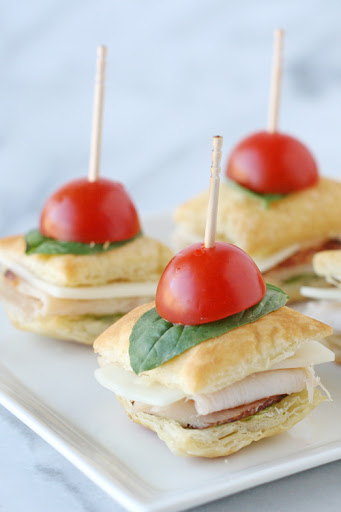 6.) Finish the mini sandwiches with a small leaf of fresh basil and a cherry tomato half, add a toothpick to hold it all together.